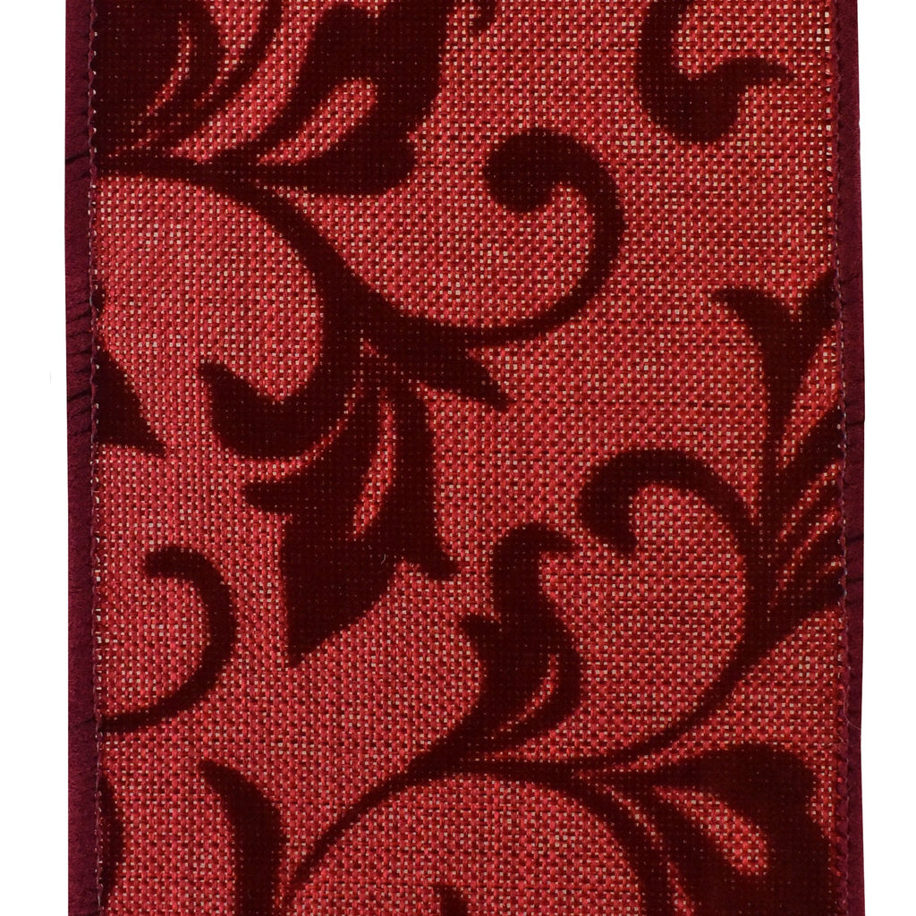 Flocked Swirls Faux Linen Wired Ribbon, 2-1/2-Inch, 10-Yard - Red