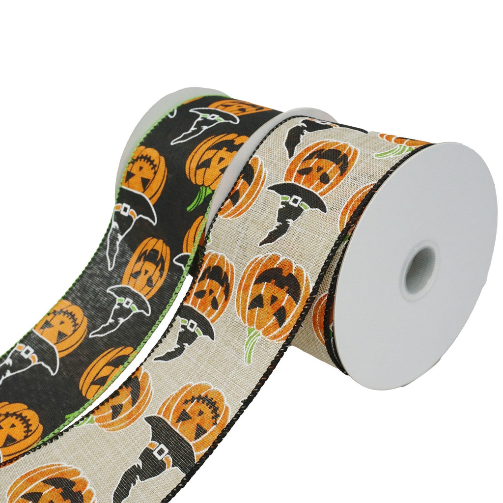 These Jack O' Lantern wired ribbons are perfect for the upcoming autumn season. The spooky Jack O' Lantern design is excellent for decorations for fall themed layouts, Halloween and other occasions. This ribbon is also great for arts and crafts, home decor projects and other DIY projects. Features an orange jack o' lantern with black witch hat design. Comes in the ribbon color natural and black.