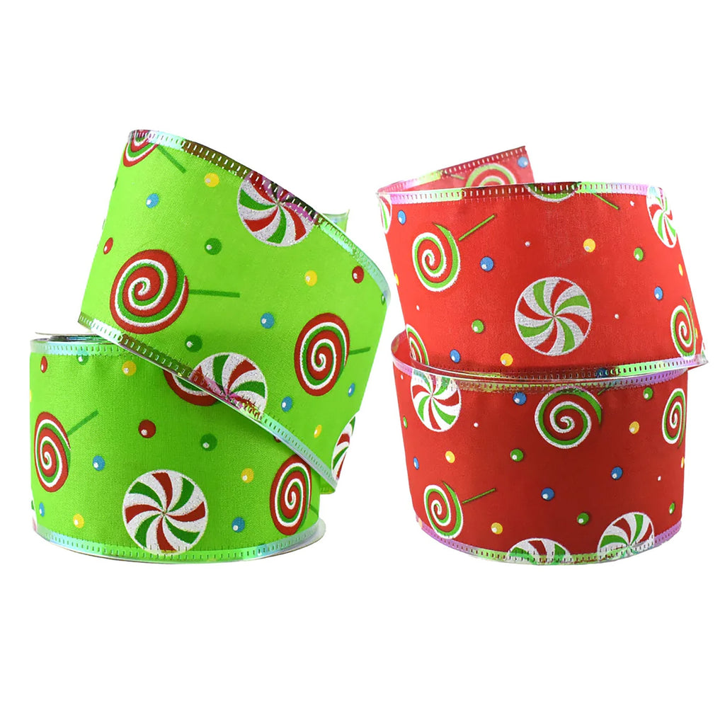 Add your own touch to any project! This ribbon features sweet lollipop and gumdrop candy patterns for the perfect touch of Christmas to any home decor, DIY, or craft project you use these with. Take your decorating or DIY to the next level! Note: Contains wire Length: 10 yd Width: 2.5"