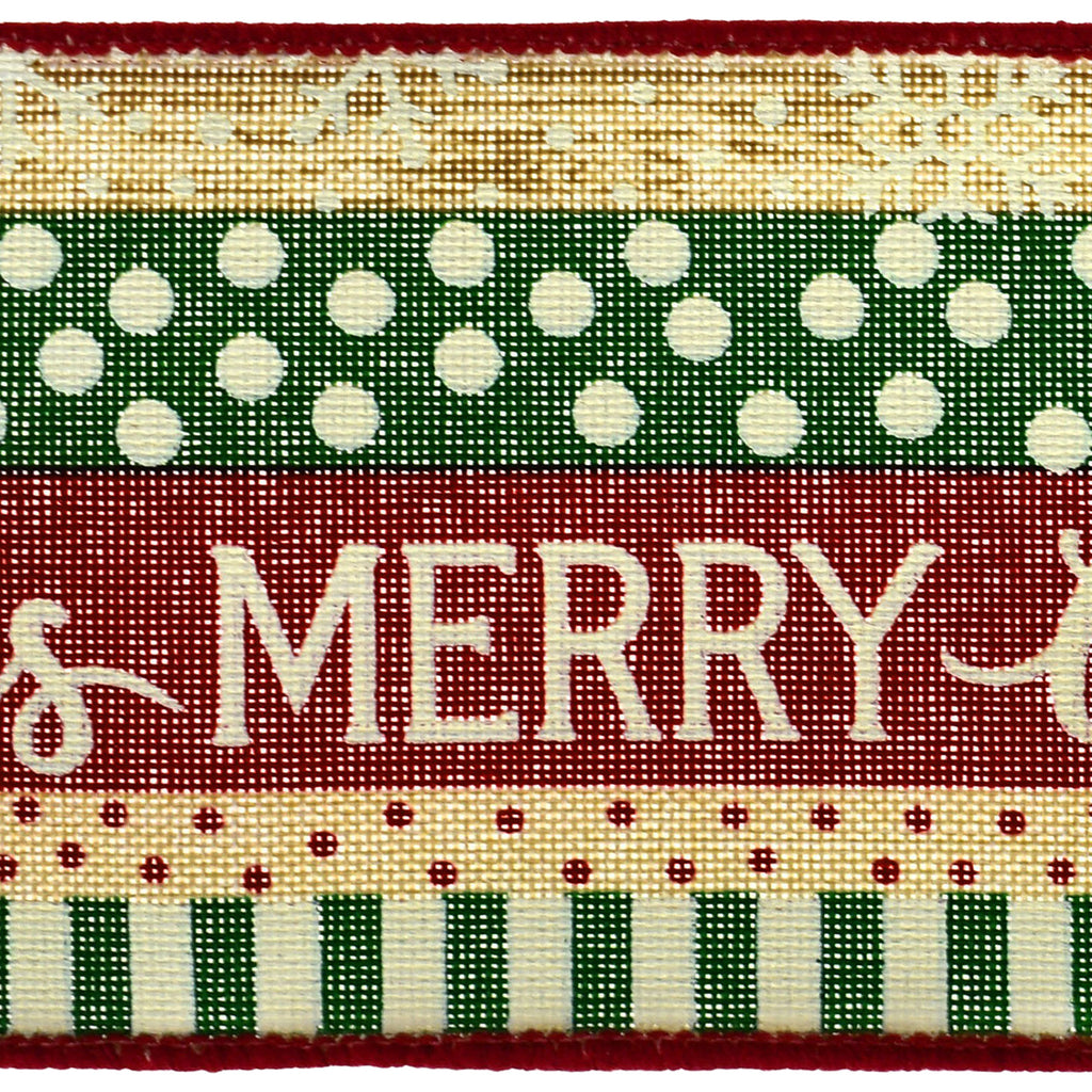 Merry Christmas Stripes Snowflakes Dots Faux Linen Wired Ribbon, 2-1/2-inch, 50-yard