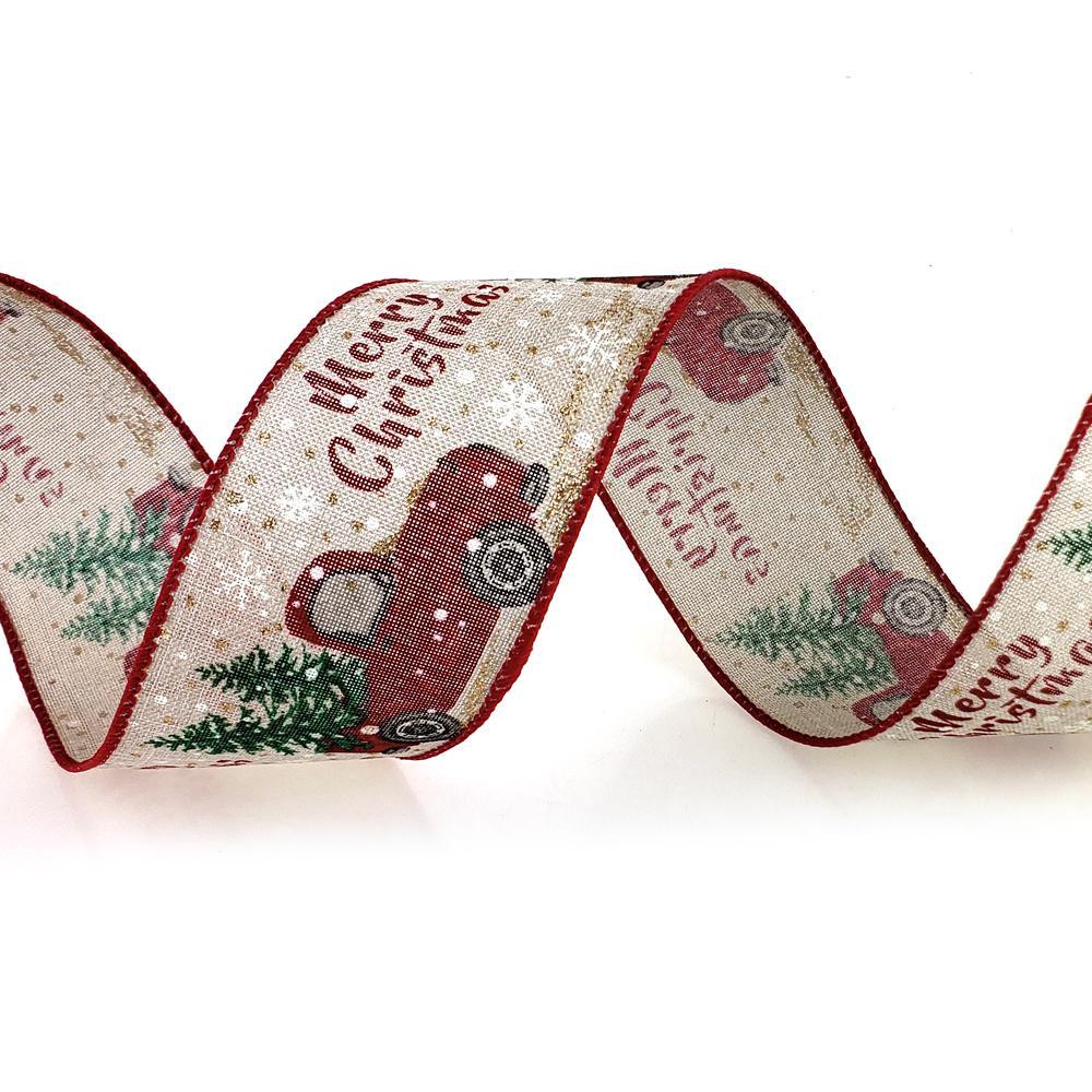 This Christmas season add a touch of sparkle to your tree and holiday decorations with this linen ribbon featuring a red Christmas truck print. Wrap around your tree, create a centerpiece, or simply use to wrap a present. This ribbon has wired edges for easier shaping.
