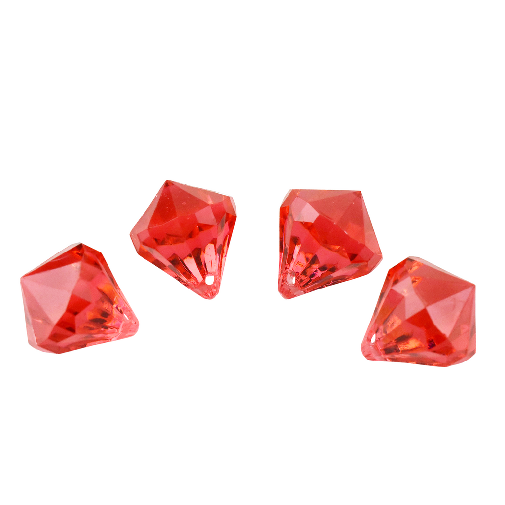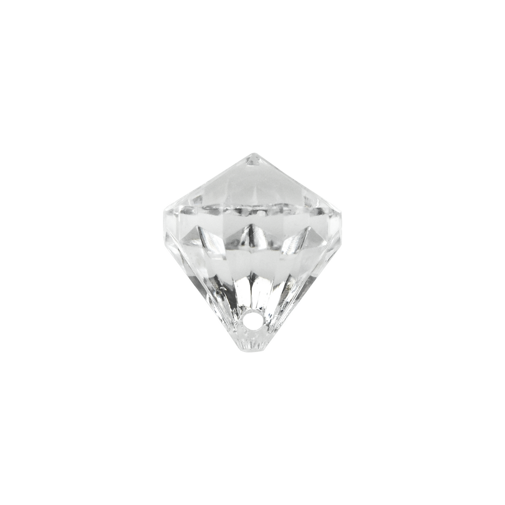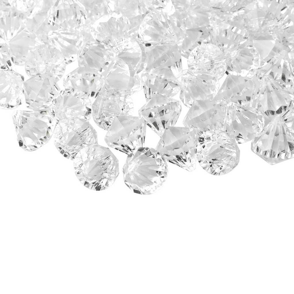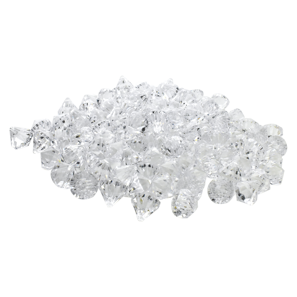 Add some sparkle to your decorations or DIY projects with these acrylic diamonds. These plastic gems are perfect for scattering on tables or filling vases to create tunning centerpieces. They each have holes so they can be hung and displayed anywhere. Diamond Length: 1" Diamond Width: .75" 100 Pcs.