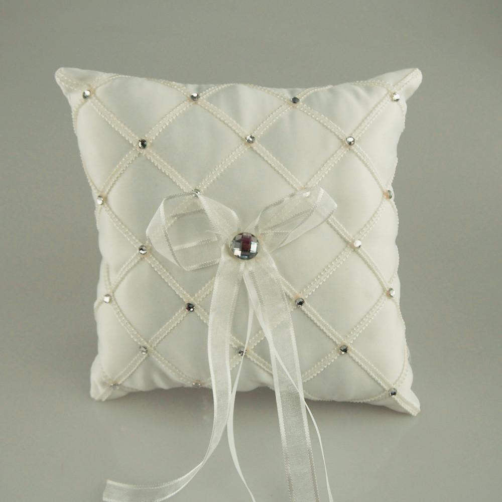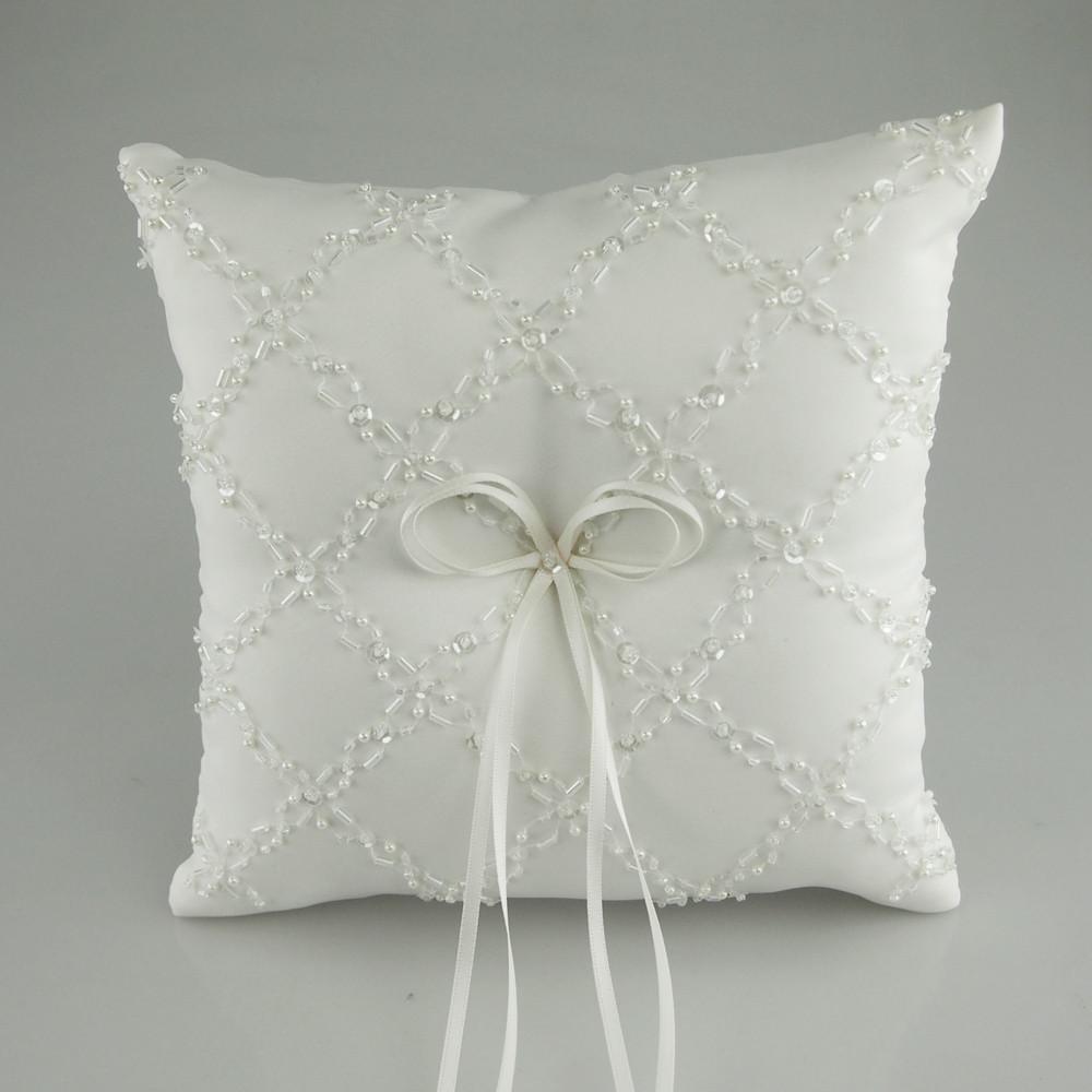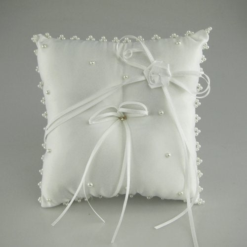 A fancy white pillow, fluffy, and soft to the touch. This pillow can be used as a ring bearer pillow for weddings, bridal showers, anniversaries and the like.