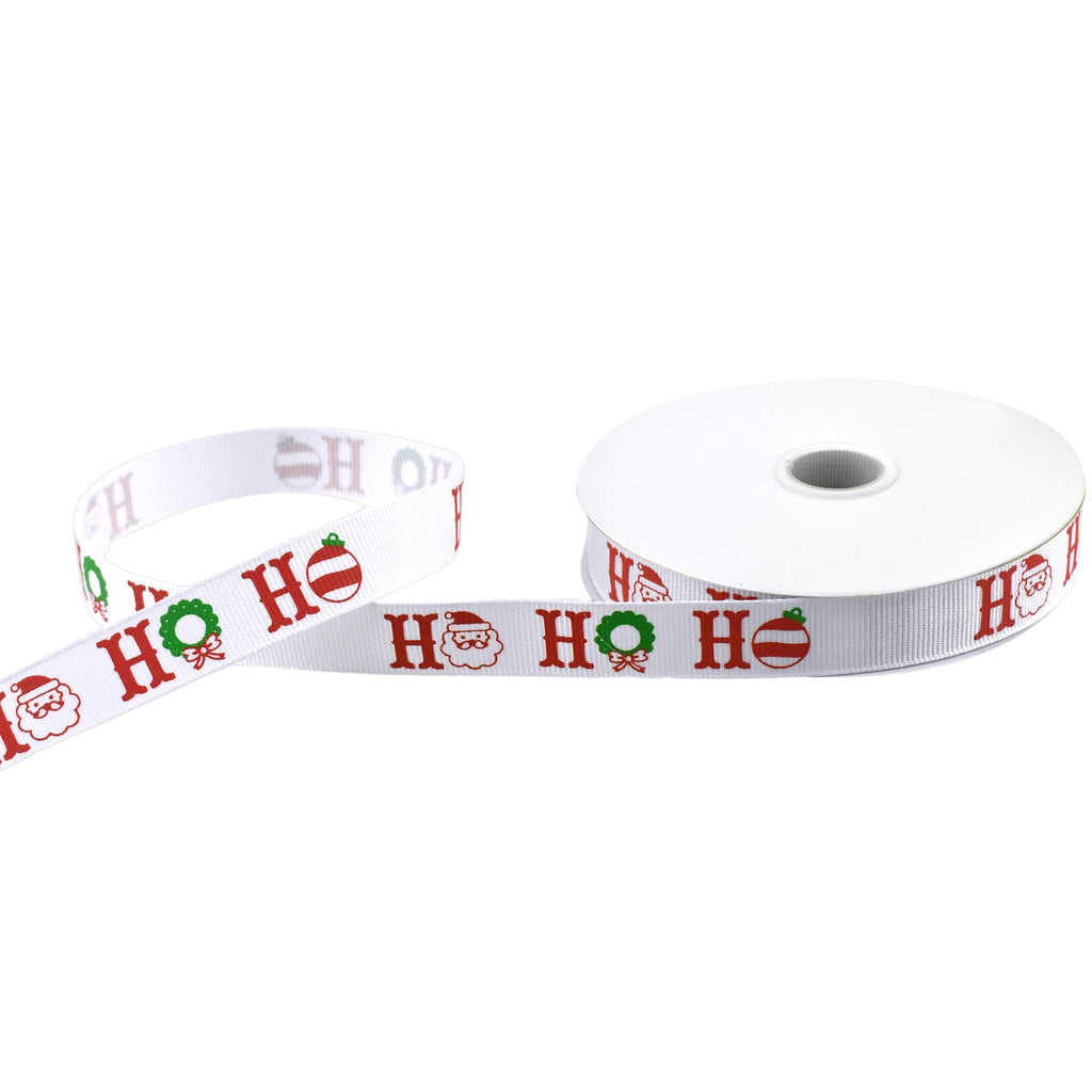 Add some festive color and style to your Christmas tree with this adorable grosgrain ribbon! This festive ribbon works well for wrapping gifts, decorating packages, or any other craft project. The patterned design of Santa icons with the iconic 'Ho Ho Ho' phrase makes this the perfect Christmas DIY accessory! Note: Does not contain wire Length: 10 yd Width: 0.625"