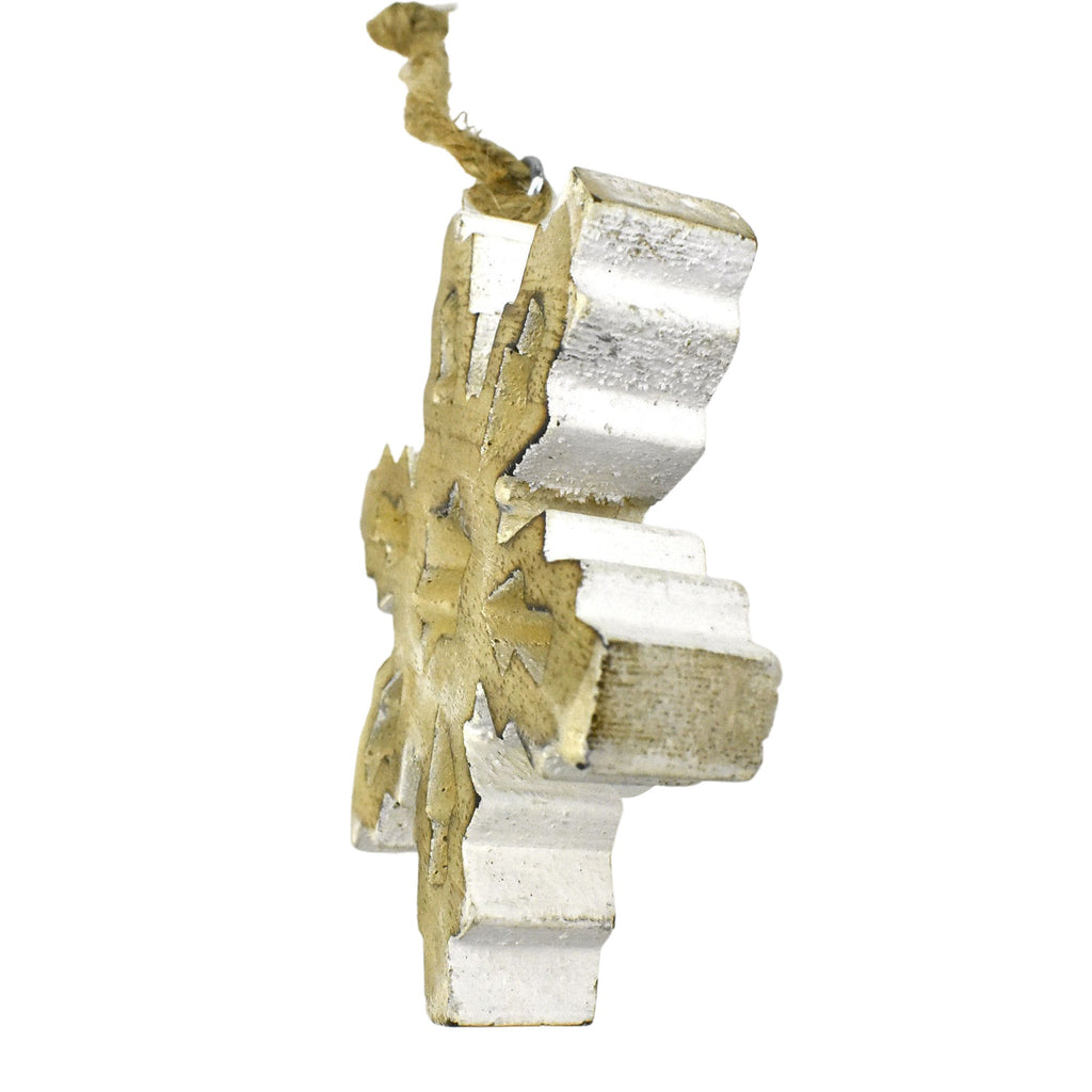 Rustic and earthy, this wooden snowflake ornament lends a natural feeling to your holiday decorations. The cut out style snowflake shape is coated with a metallic brushed paint finish, designed to show off the natural beauty of the wood while still having a classic look that's perfect for year-round use. Add this wooden ornament to your home decorating as a new year's decoration or simply as part of a seasonal collection! Length: 3.75" Width: 3.5"